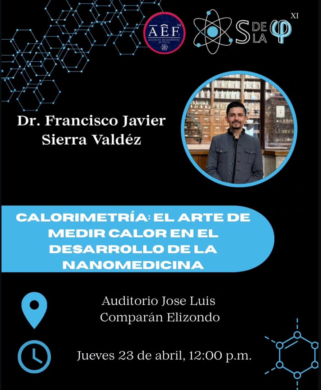 La Facultad de Ciencias Físico Matemáticas de la Universidad Autónoma de Nuevo León, en colaboración con la AEF, invita a participar en la Semana de la Física asistiendo a la conferencia “Calorimetría: el arte de medir el calor en el desarrollo de la nanomedicina”, impartida por el doctor Francisco Javier Sierra Valdéz. En esta charla se abordará la aplicación de la calorimetría para estudiar procesos térmicos en sistemas biológicos, así como su papel en el desarrollo de la nanomedicina.